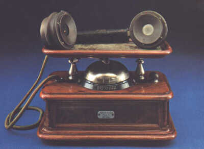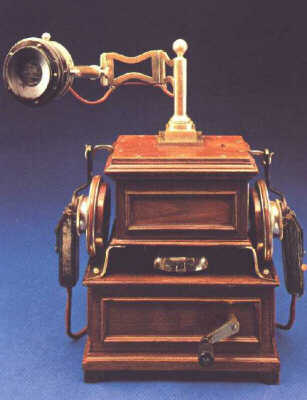 - case of walnut - Handset with tin telephone with ringmagnet and carbon- cylinder microphone - induction coil - battery calling - DC ringer - Lightning arrester - local battery working with DC- busy test